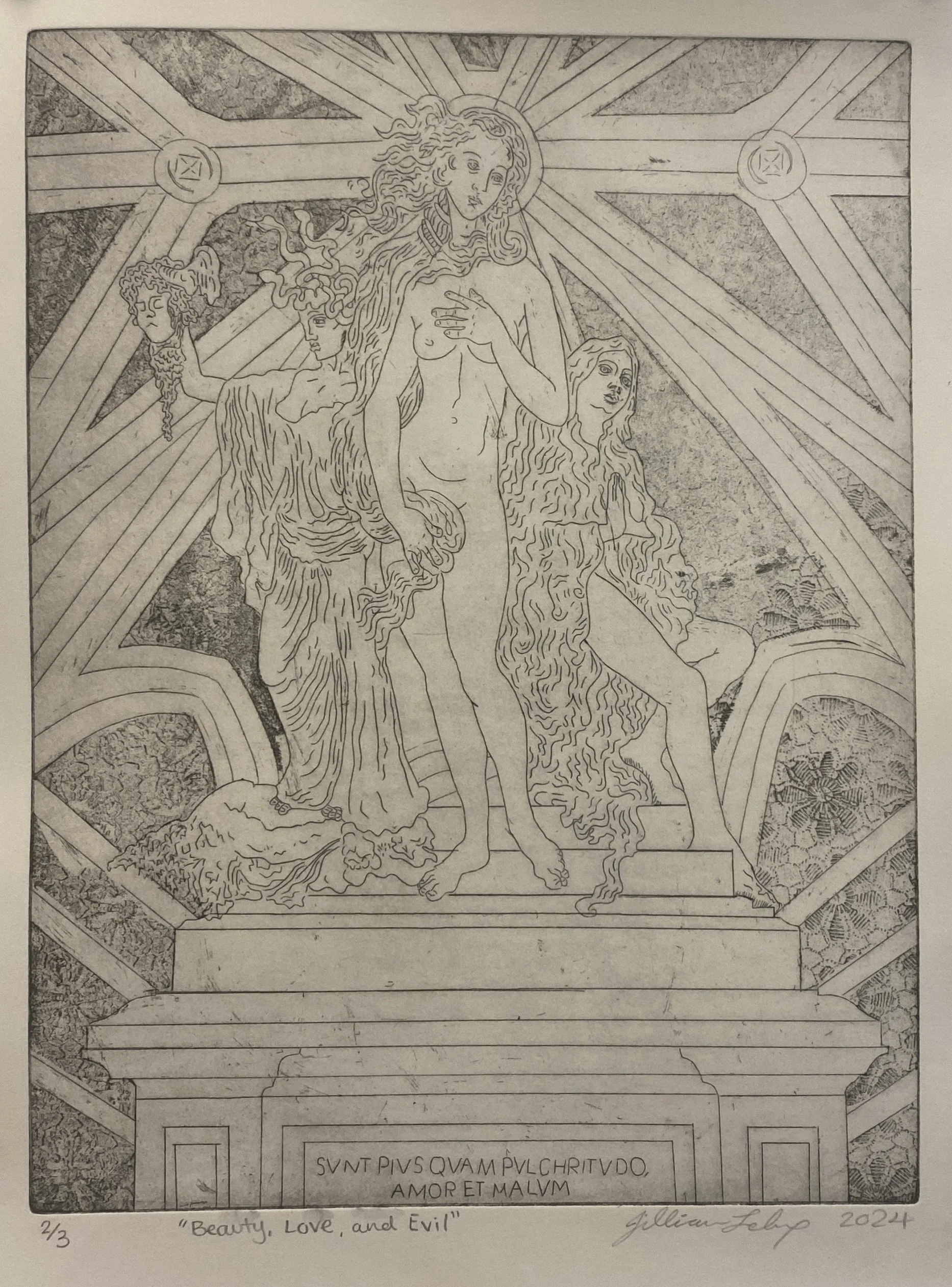 Inspired by the statuesque women of art history I encountered during my studies in Florence, this piece draws from classical representations of Venus, Mary Magdalene, and the sculpture of Perseus with Medusa. Each figure embodies a cultural archetype, Beauty, Love, and Evil, revealing how women have been idealized through time.
